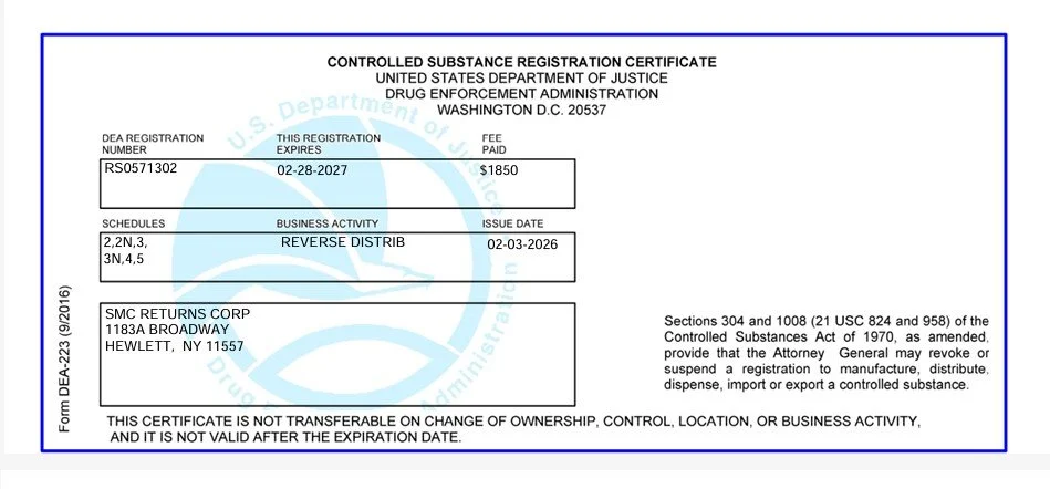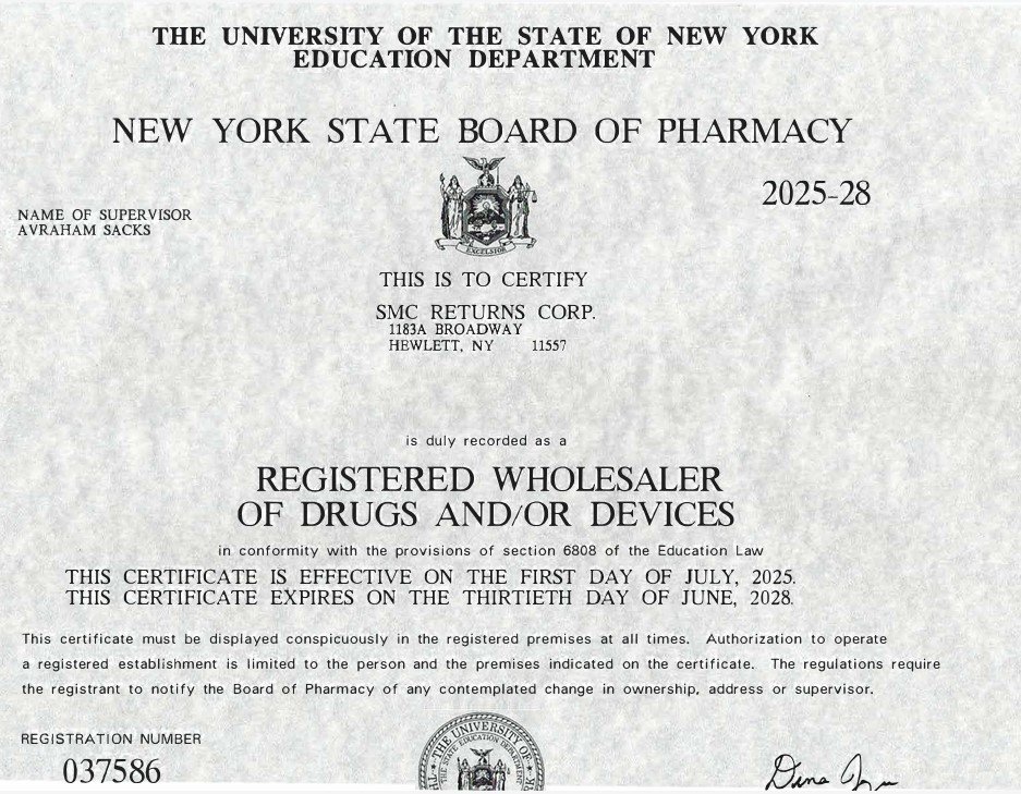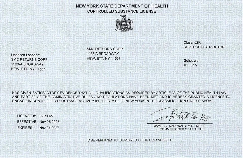 SMC Returns LicensureClick certificates below to enlarge. Additional Non-Resident State licenses available for clients upon request. New York State Controlled Substance License New York State Reverse Distribution License DEA Certificate